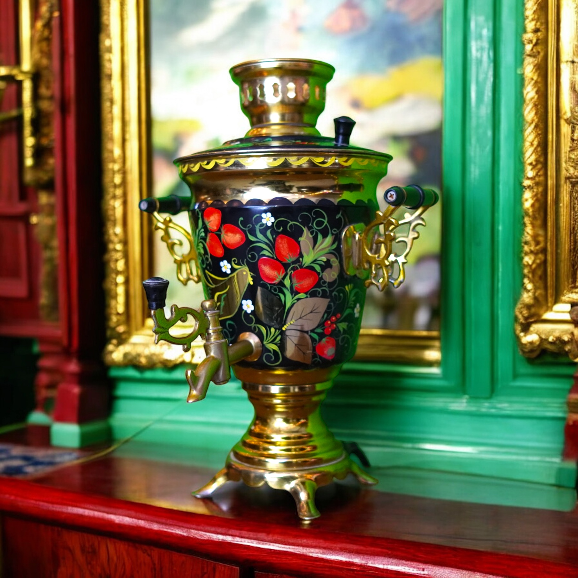 Hand-Painted Russian Samovar – Floral Gold & Black This vintage Russian samovar is more than just a tea maker—it’s a piece of cultural history. Hand-painted with bold strawberries, golden leaves, and delicate floral accents, it shines with timeless beauty. Whether used for serving tea or displayed as a centerpiece, it adds old-world charm and a warm gathering spirit to any home.